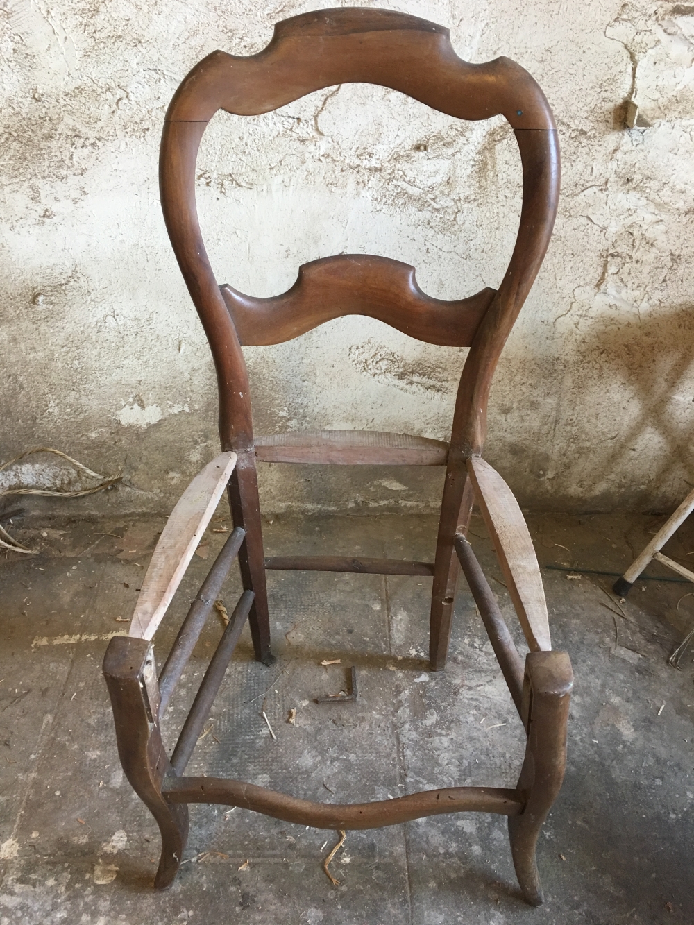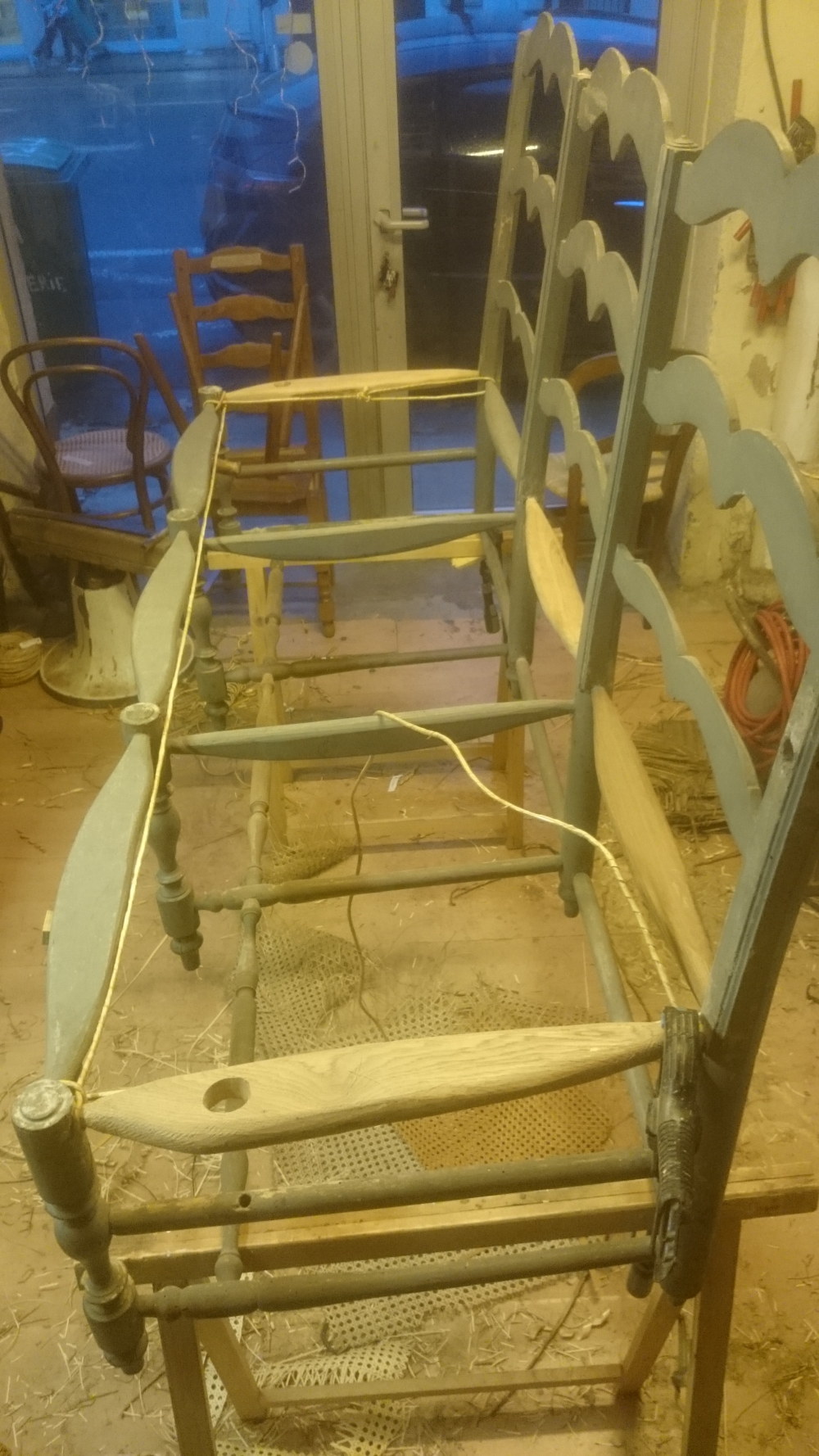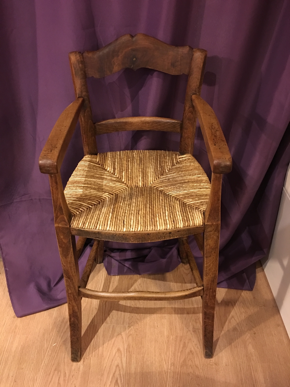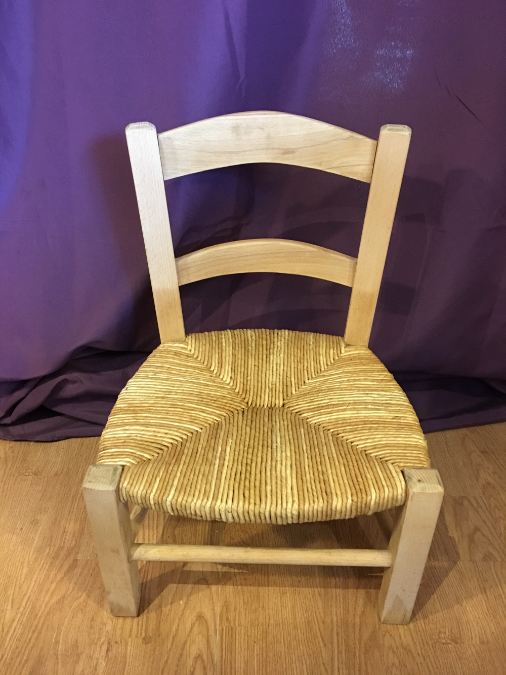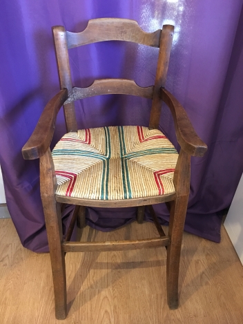 Rempaillage d'un fauteuil enfant en toron naturel marron et rouge Prix ; 65 euros |