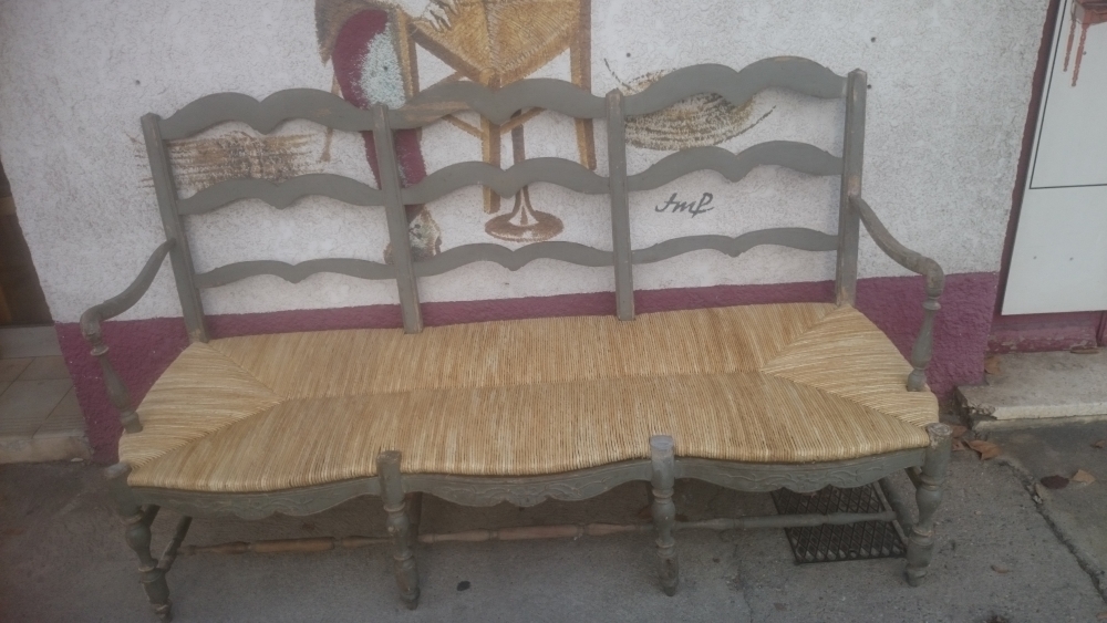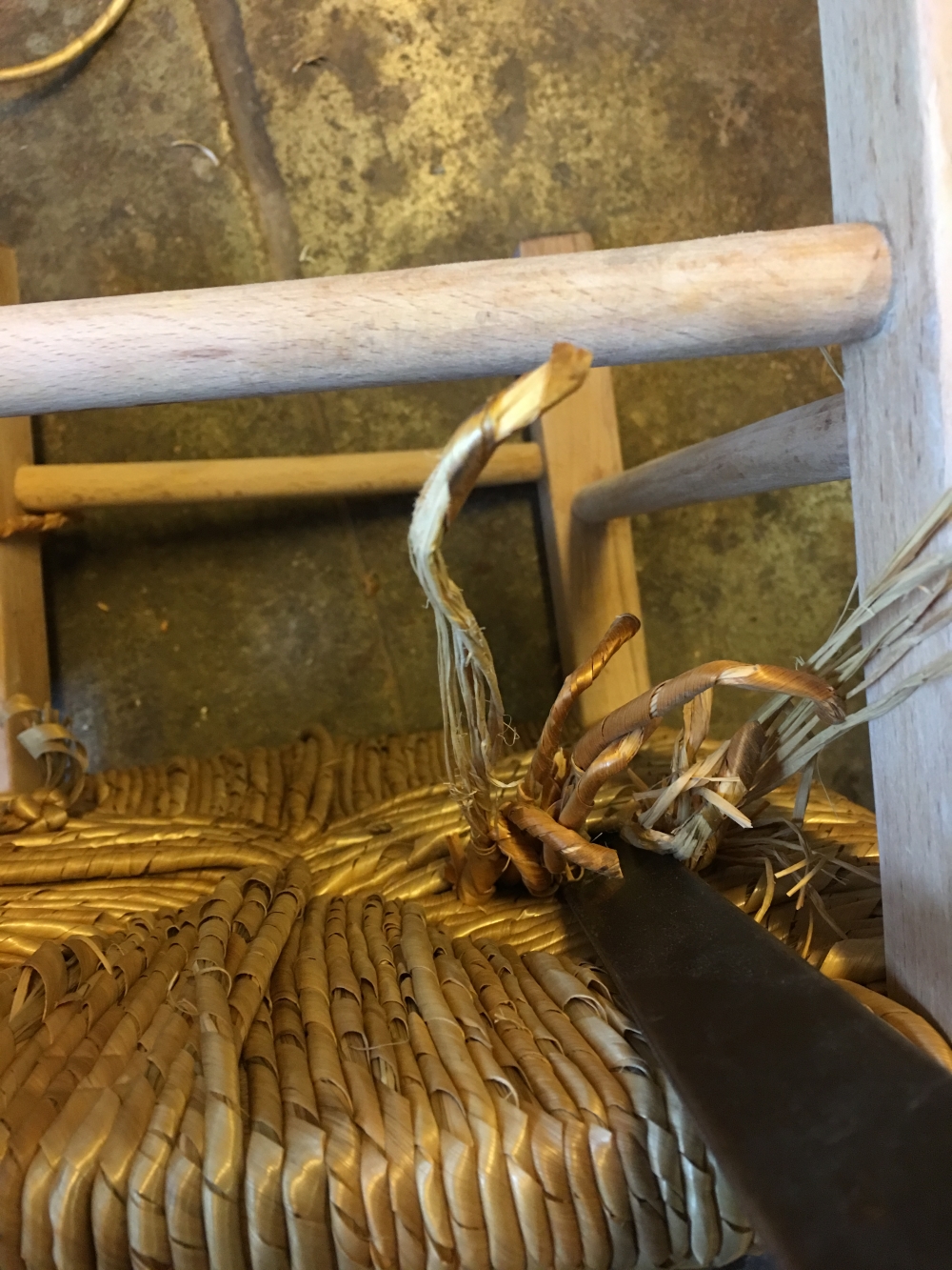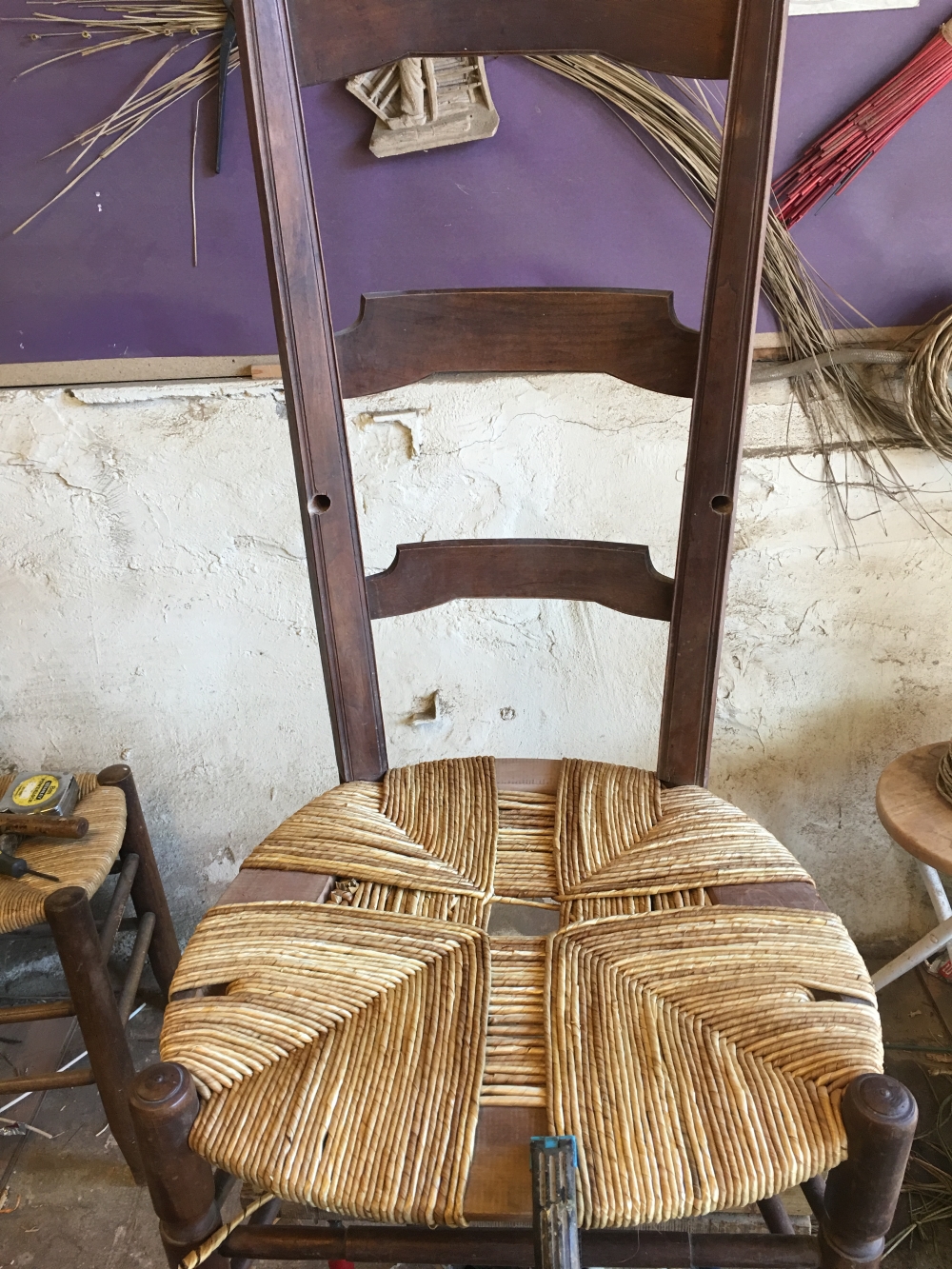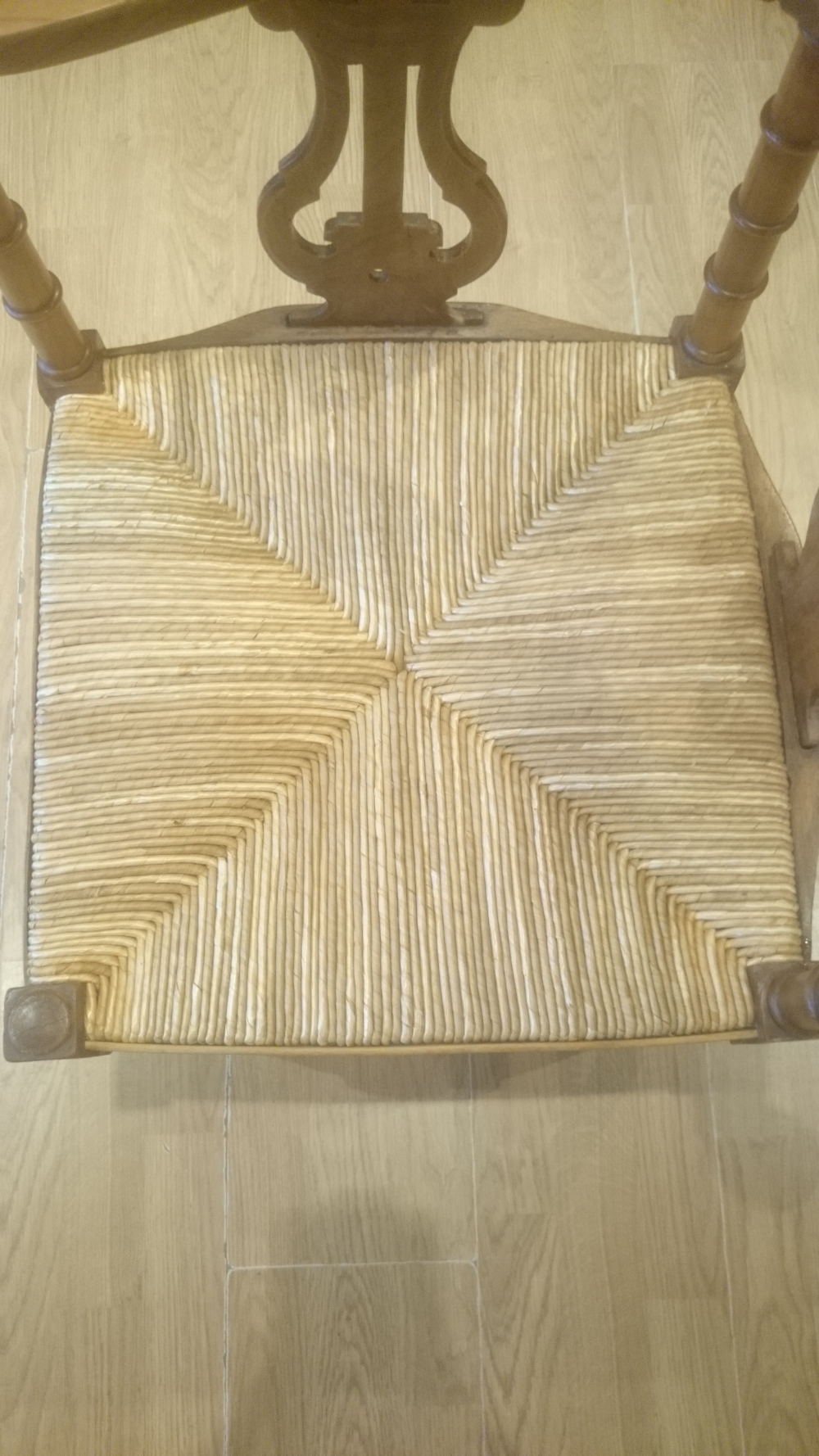 Rempaillage d'une chaise provençale Rempaillage de chaise en paille naturelle dorée avec traverse sous paille fixe Prix : 105 euros |